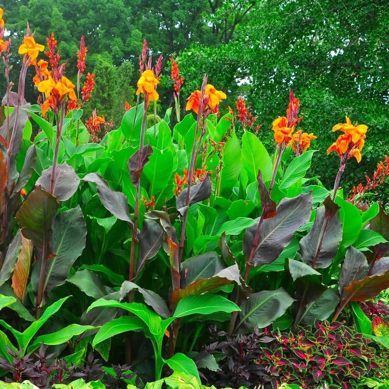 Cannas are statuesque plants with enormous leaves and flowers that follow suit. Site these horticultural Titans where they'll have room to grow, such as along property lines, foundations, or at the edges of ponds. They're also excellent in borders, raised beds, and large patio pots. Give them a spot where the soil drains well, and they'll receive full to partial sun.
