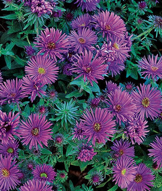 The glory of autumn, this aster is native to much of eastern North America and is widely adapted and nearly pest-free. It's a dwarf cultivar that typically grows to be 18-24" tall and up to 3' wide, and sports purple 1 1/2" flowers with yellow centers. Butterflies love it.