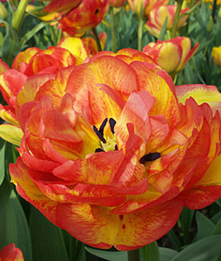 Sundowner is a spectacular color-changing tulip that starts with a combination of yellow and orange and changes over time to a dominant red. Full double flowers can't be missed in the garden. Double late tulip group, blooming in late-spring. Bulb size: 12 cm.