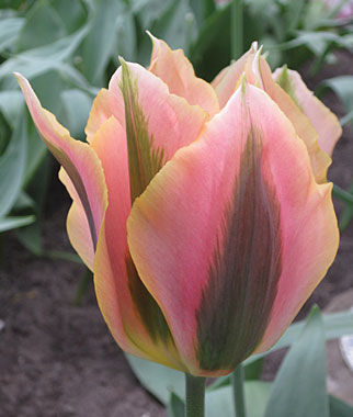 ¡°Viridiflora¡± means green flower, and so this one is¡ªaccented with salmon-pink. It¡¯s an exotic and matchless cut flower and readily naturalizes in your garden; once established, it will last for years. Viridiflora tulips bloom in late spring and are perfect planted with single early tulips like Princess Irene or Salmon Prince. Bulb size: 12 cm.