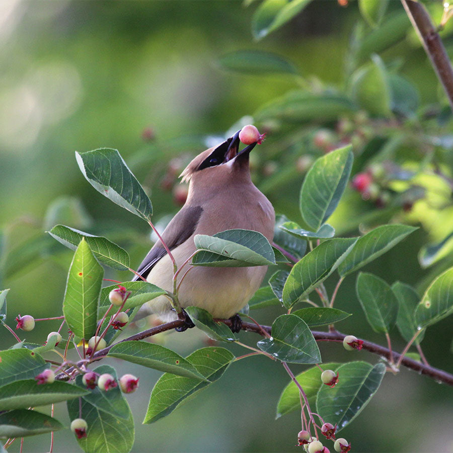 Amelanchier canadensis, commonly called shadblow serviceberry, is a deciduous, early flowering, large shrub or small tree which can grow up to 25-30 feet tall. It boasts showy, slightly fragrant, crisp white flowers in drooping clusters which appear before the leaves emerge in early spring contrasted against finely toothed, medium to dark green leaves that change to a stunning orange red in autumn. The flowers give way to small, round, green berries which turn red and finally mature to a dark purplish-black in early summer. The edible berries resemble blueberries in size and color and are often used in jams, jellies and pies! You won't be the only one who loves the little berries, your feathered friends will flock to this tree as well. It is easily grown in average, medium, well-drained soil in full sun to part shade and looks great in woodland and native gardens especially contrasted against dark or shady backgrounds which highlights its form, flowers, and fall color. Wherever you choose to plant it will delight you with seasons of interest.