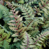Burgundy leaves and stems display striking contrasts with long, elegant green fronds enhanced with silver overlays on each leaflet on 'Regal Red', an exciting Japanese Painted Fern. With twisted and curled tips, the dense foliage adds texture to indoor arrangements as well as shade borders.